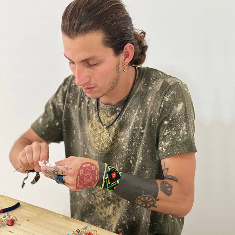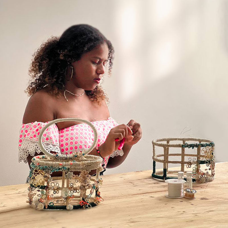 Our wire artisans are a group of young women and two men (18-29 years) in Santa Marta, Colombia. They are from a very underprivileged group who experiences violence, neglect, and poverty. It’s not uncommon for ten people to live in one house, and many people from this group have been incarcerated. This group gives its members an opportunity to exchange their weapons for tweezers, and reintegrate into society. They are in charge of embellishing the pieces in palm, and jewelry that includes wire embroidery using 24-karat gold-plated bronze wire fabrics and silver wire.