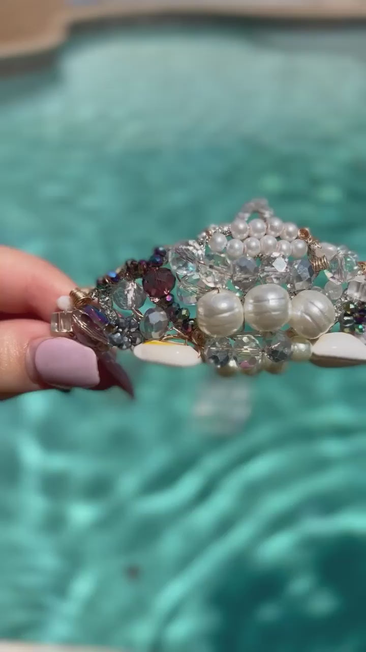 Pearl-studded tiara crown embellished with beads, precious gemstones and shells.