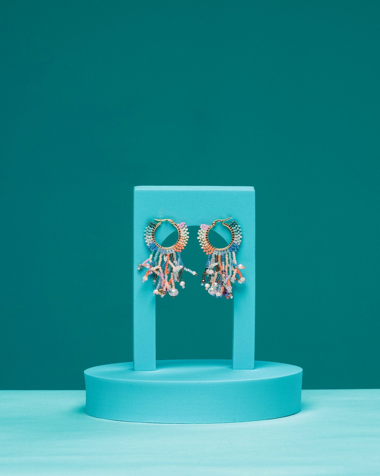 Fully beaded, gold hoop earrings with drop 'coral' fringe.